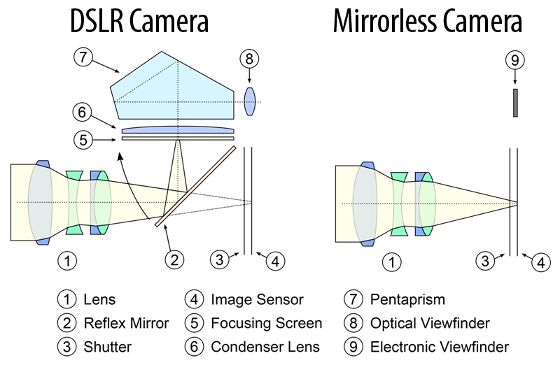 Trong khi máy ảnh DSLR sử dụng cơ chế gương lật để phản chiếu ánh sáng vào kính ngắm quang học hoặc truyền trực tiếp đến cảm biến, thì máy ảnh mirrorless hoàn toàn không có cơ chế gương này (đúng như tên gọi của nó). Điều này có nghĩa là ánh sáng đi qua ống kính luôn đi thẳng tới cảm biến hình ảnh.